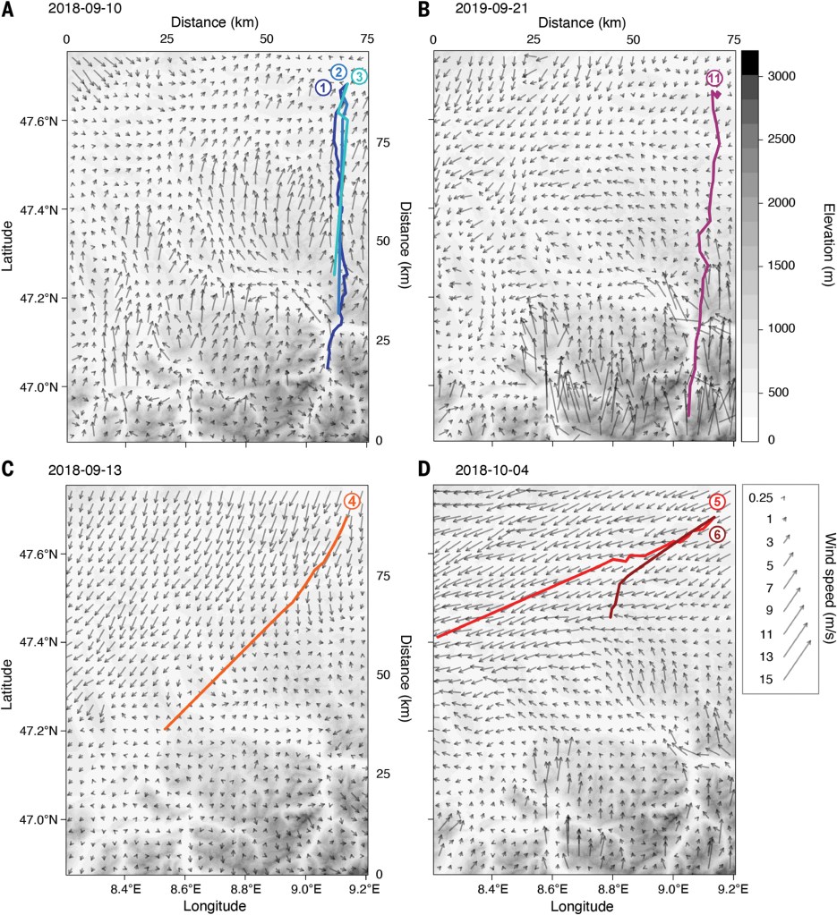 principalmente venti contrari (A e B) ma viaggiando verso sud-ovest e quindi costeggiando le Alpi in condizioni di vento in coda (C e D). I colori rappresentano individui diversi