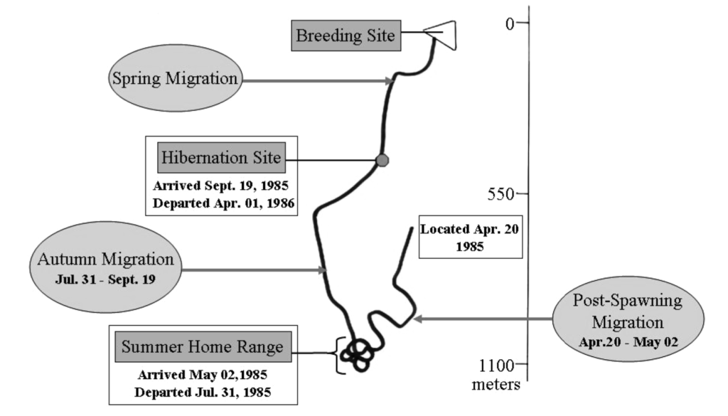 Le migrazioni riproduttive spesso vengono precedute da metamorfosi morfologiche e fisiologiche anche molto accentuate. Nei rospi maschi aumenta l’elasticità della pelle, si ingrossano i calli nuziali ed i colori divengono più sgargianti. Alcune tra le metamorfosi riproduttive più eclatanti sono quelle che si osservano nel tritone crestato (Triturus carnifex Laurenti, 1768), un anfibio urodelo (il gruppo di anfibi muniti di coda) che popola i boschi europei. Ha una pelle granulosa color blu-scuro ed una striscia dorsale gialla che corre dal capo alla coda, mentre con il sopraggiungere del periodo degli amori cambierà colore e forma del corpo, sviluppando una livrea più chiara con delle macule blu concentriche, un ventre arancione acceso, anch’esso con macchie blu, ed una vistosa cresta dorsale dentellata. La sua stessa biologia cambia e si adatterà a trascorrere questa tempo in una forma acquatica: i rituali di corteggiamento e l’accoppiamento avvengono infatti sott’acqua, in stagni, pozze temporanee o fontanili! Solitamente terminato il periodo riproduttivo i tritoni crestati da cigni ritornano anatroccoli: la vita terrestre ricomincia.