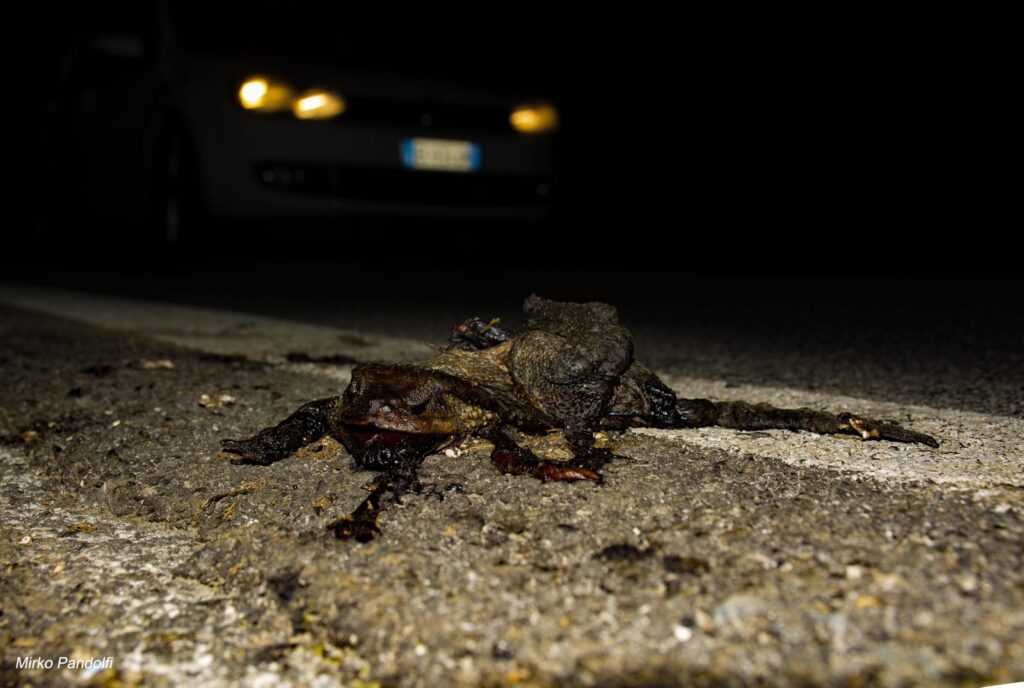 Uno, due, dieci, cento, centinaia di piccole sagome rivelate dal chiaro di luna, puntano tutte in un’unica direzione. Laddove la vegetazione si fa più rada s’intravede brillare la pupilla rossastra del rospo comune (Bufo bufo Linnaeus, 1758)!