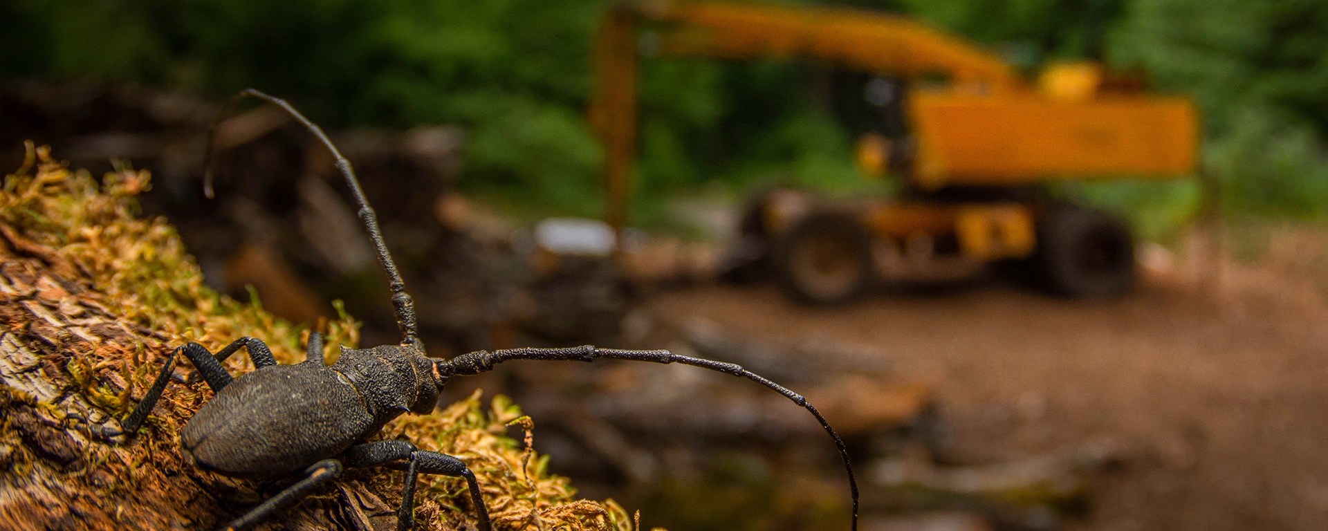 La foto è stata scattata in una legnaia sui Monti Lepini, precisamente nelle zone di Montelanico. Ero andato lì con un amico per cercare cerambicidi in generale, dato che l’elevata quantità di legno morto li attira da quelle parti. Dopo tante ricerche infruttuose, trovo finalmente questo Morimus asper e dopo qualche scatto “classico” ci rendiamo conto dello sfondo che avevamo a disposizione: l’ambiente del nostro soggetto che stava venendo disboscato, e anche la macchina che stava venendo usata. Lì ho subito provato a fare questo scatto, e a quanto pare il risultato è stato ottimo.