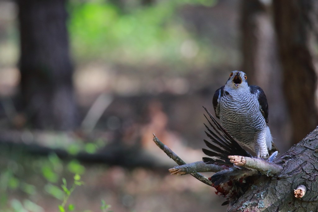 Il passaggio fugace di un astore è un qualcosa di appena percepibile, come in un sogno, tutto si ferma e un silenzio tombale irrompe prepotentemente nella quotidianità dei più piccoli abitanti della foresta. Cince, merli, ghiandaie e colombacci si scambiano in codice premonitori segnali d’allarme. Sostare nelle piccole radure tra la foresta spesso e volentieri rende queste prede vulnerabili al fluttuare fulmineo del rapace. Sarà un verso improvviso e satanico a ristabilire un po’ di tranquillità momentanea: è il grido trionfante del maschio che ha appena estratto a sorte la sua preda sacrificale e orgoglioso e severo richiama l’attenzione della consorte, che senza indugi arriverà nel ramo prescelto per carpire il bottino. Del vorace pasto non resterà altro che una soffice spiumata del malcapitato, che verrà lentamente setacciata dal vento.