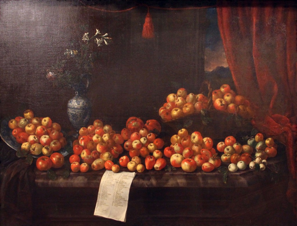 Un’altra opera del pennello di Bartolomeo Bimbi (per approfondimenti vedi l’articolo sul Melone), dove documenta tutte le varietà di mela all’interno della Corte Medicea di Cosimo III e racchiude i loro nomi all’interno di un cartiglio. Ci sottolinea l’incredibile ricchezza di specie e di diversità frutticola del tempo.